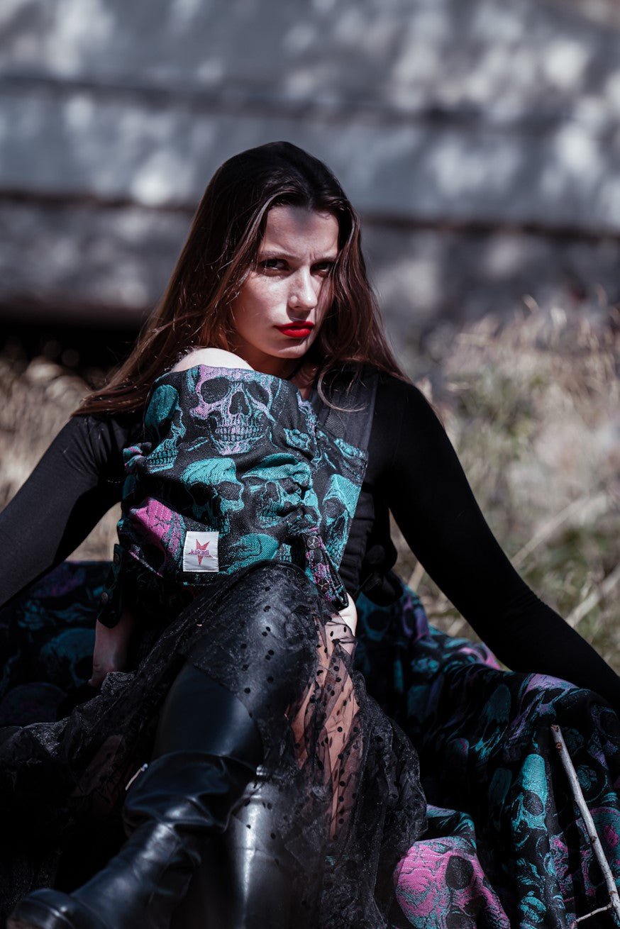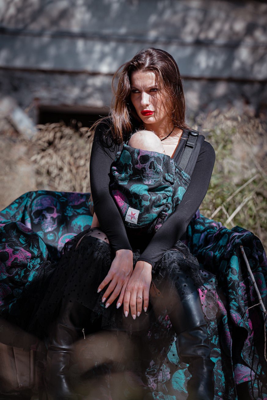 Schaurig süße Begleitung für Halloween! Unsere KOKADI Scary Skulls Babytrage kombiniert Grusel und Gemütlichkeit auf einzigartige Weise. Mit einem fesselnden Design aus schaurigen Schädeln und zuckersüßen Farben ist diese Babytrage ideal, um dein Baby stilvoll zu tragen.