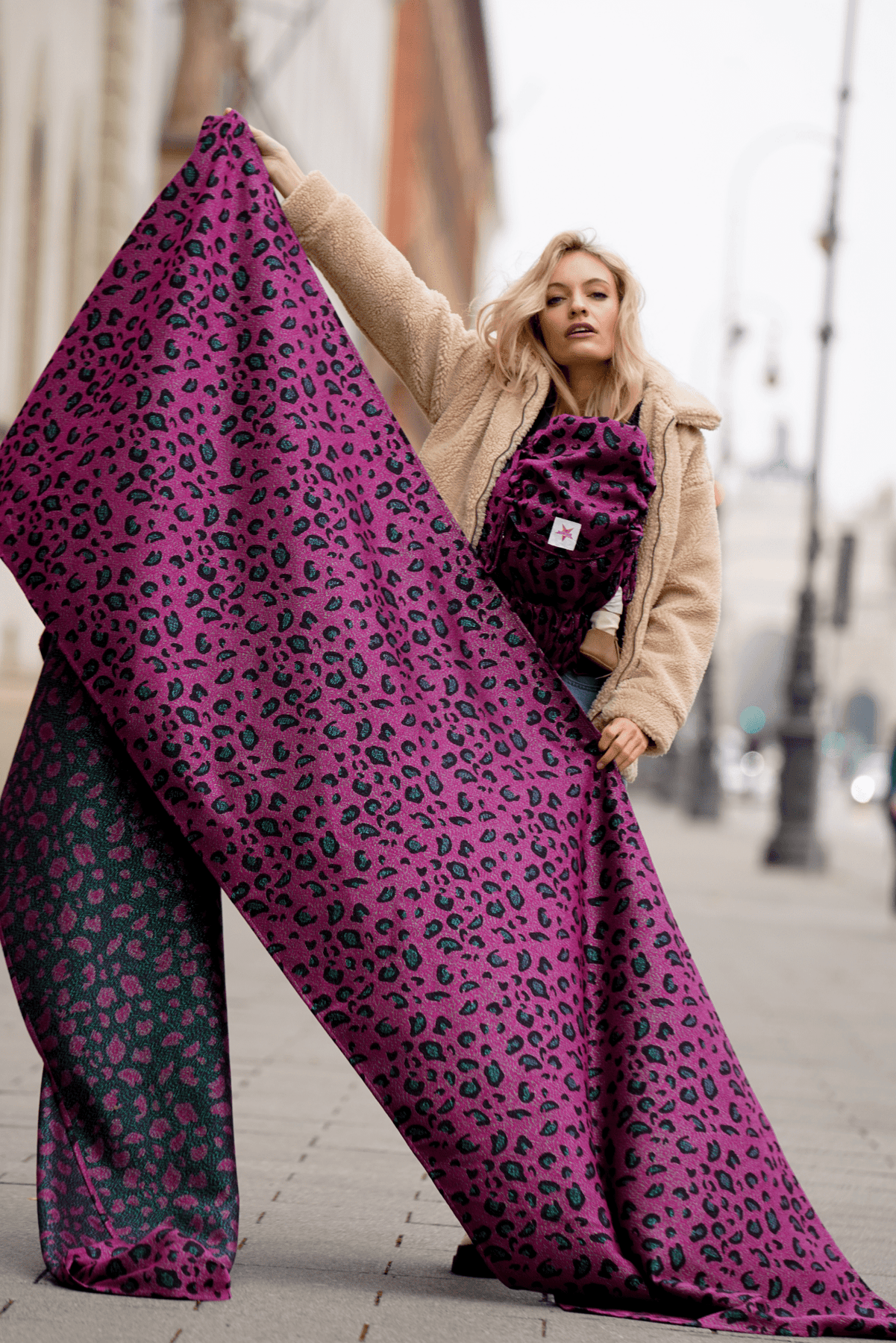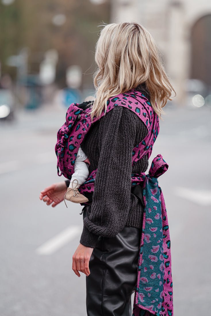 Seidig, fließender Stoff und angesagter Leopardenprint in leuchtendem Pink der von funkelnden grünen Glitzerfäden durchzogen ist. Diese Babytrage wird dein Herz höherschlagen lassen - das ist Safari Caspar!