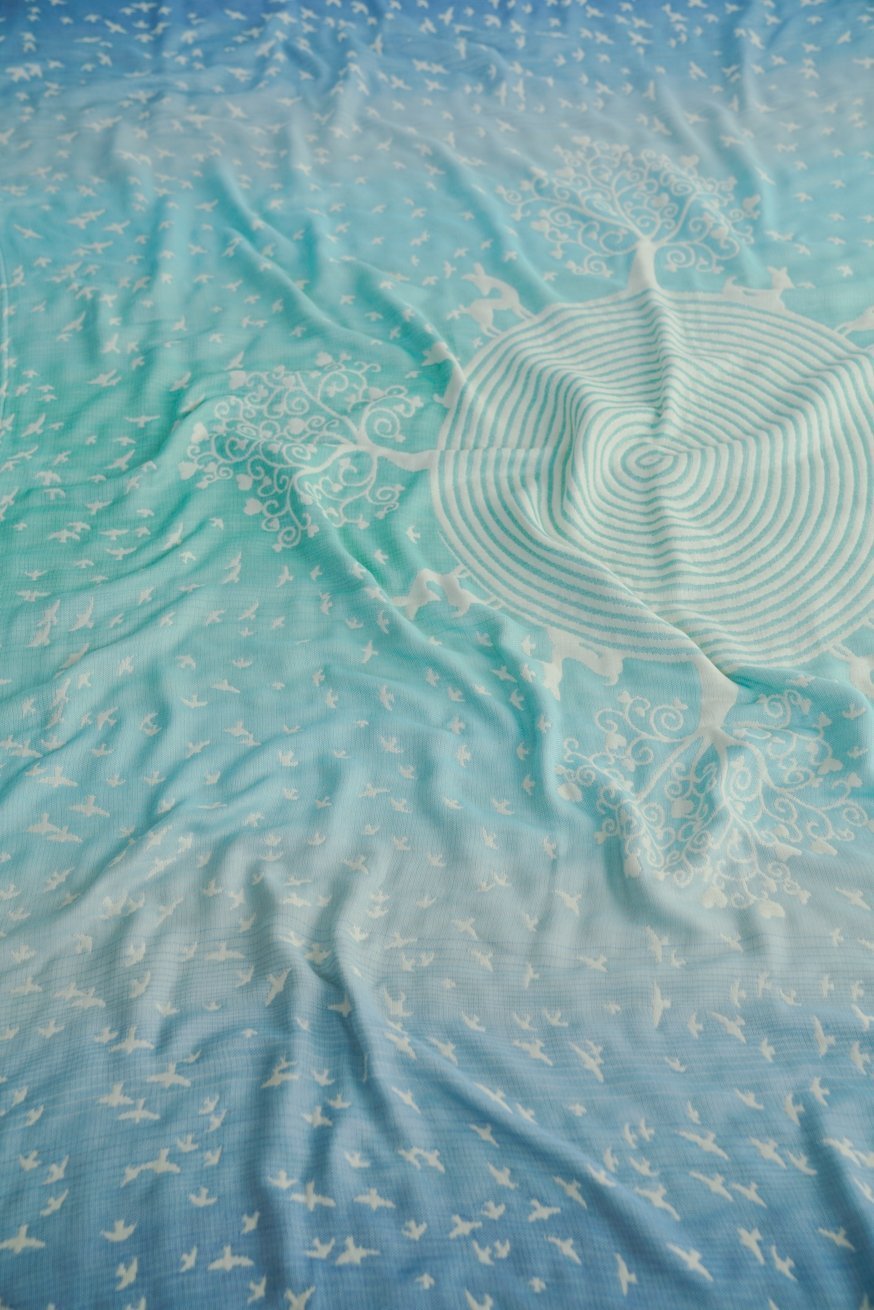 Die Mamadecke Max im Wunderland ist ein fluffig weicher Kuscheltraum für die ganze Familie! Der harmonisch blaue Farbverlauf auf cremigen Naturweiß in Kombination mit unserem Wunderland Design lädt dich zum Schmusen und Träumen ein.