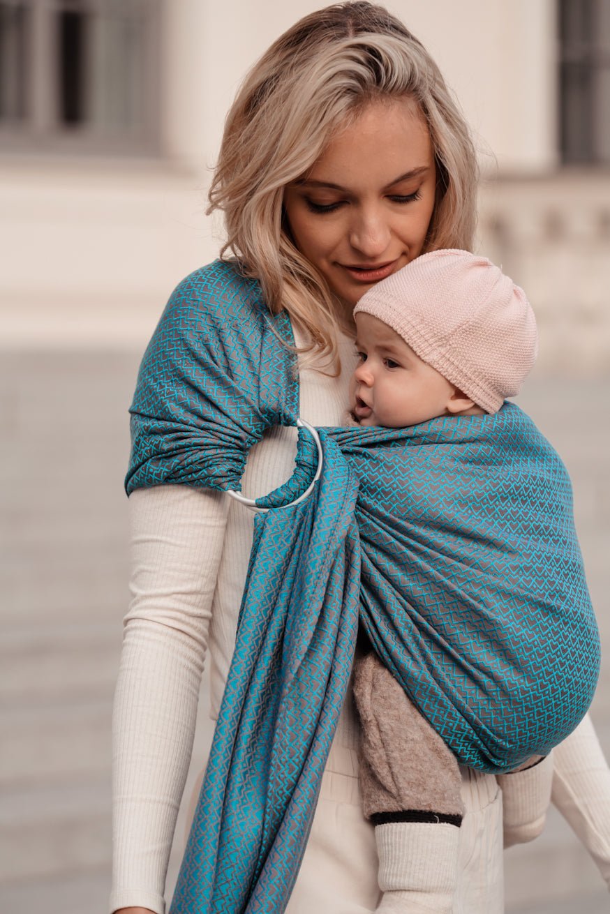 Prächtiges Petrol-Blau und elegantes Anthrazit lassen unser schlichtes Design mit dem besonderen Touch im Licht changieren und machen ihn zum ultimativen Eye Catcher. 100% beste, easy care Bio-Baumwolle, erstklassig verwebt in einmalig weicher und fließender Jacquard Webung, macht unser schönes Heart2Heart Lagoon zu einem kuschelig leichten Tragetraum für dein Baby und dich. Durch das traumhafte Flächengewicht von 170g/m2 eignet sich der schlichte und schöne KOKADI RingSling nicht nur besonders gut für heiße Sommertage, sondern vor allem auch für noch ganz kleine Babys. So kannst du dein Baby bereits ab der Geburt in unserem Heart2Heart Lagoon Sling liebevoll umschmiegt an dich gekuschelt tragen.