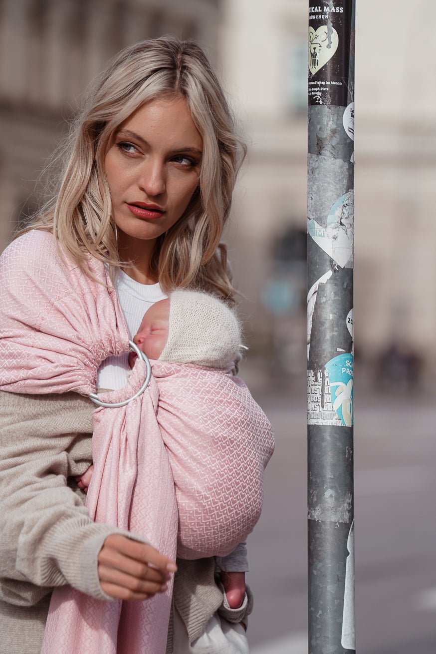 Dezent, anschmiegsam und unheimlich schön - 100 % beste, easy care Bio-Baumwolle, erstklassig verwebt in einmalig weicher Jacquard Webung, machen unser schönes Heart2Heart Rosé zu einem besonders kuscheligen Tragetraum für dein Baby und dich.