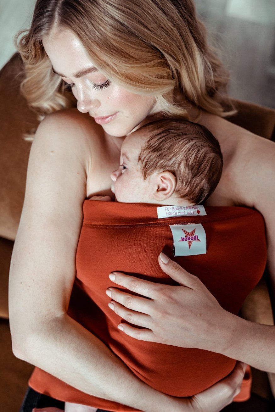 Das nackte Baby muss aufrecht und in direktem Hautkontakt an der Brust der Mutter oder des Vaters platziert werden. Die Beine des Babys sind angewinkelt in der „Froschposition.“ Der Kopf des Babys wird vorsichtig zur Seite gedreht, damit die Atemwege frei sind. Das Band muss bis unter die Ohren des Babys reichen, denn nur so wird der Nacken des Kindes gut gestützt.